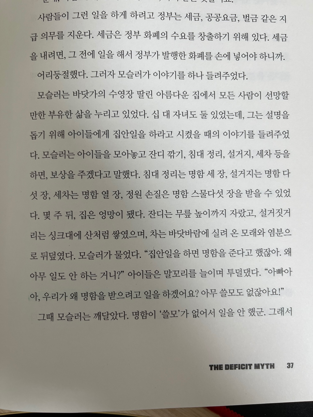 <적자의 본질>에서는 MMT의 아버지라 불리는 워런 모슬러라는 성공한 월 스트리트의 투자자의 말을 빌려 새로운 관점의 화폐의 본질을 보여준다. 위의 그림은 <적자의 본질>일부분을 발췌한 것이다. 이 그림에서 모슬러는 자녀들에게 "명함"을 줄 테니 집안일을 해달라고 부탁하지만, 자녀들은 그 누구도 집안일을 하지 않는다. 답답한 모슬러는 자녀들에게 왜 일을 하지 않았는지 물어보자 아이들은 "아빠아아, 우리가 왜 명함을 받으려고 일을 하겠어요? 아무 쓸모도 없잖아요!"라고 말했고, 그는 깨달았다. 그래서 그는 매달 명함 30장씩 내지 않으면 그동안 누려왔던 권리도 없을 것이라 선언하였고, 그때서야 아이들은 명함을 받기 위해 일을 하기 시작하였다.
