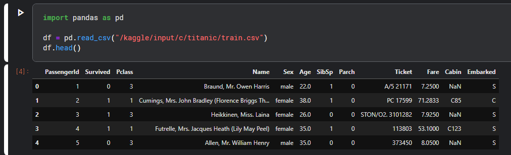 대부분이 그렇지만, 캐글의 타이타닉 대회를 시작으로 향후에는 상금이 걸린 대회까지 입상을 하는 상상을 하며 도전해보았지만 생각보다 타이타닉 대회의 벽이 높게만 느껴졌다. 기계학습이나 데이터 분석에 대해 하나도 알지 못하는 상태로 도전하다 보니, "df.head()"를 통해 확인한 데이터 테이블의 벽은 높게만 느껴졌다.