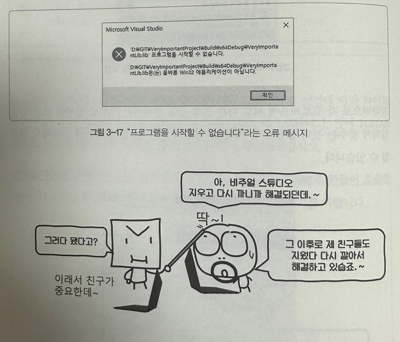 위 그림의 미친 감자처럼 이해할 수 없는 비주얼 스튜디오의 오류창을 보며 파일을 삭제한 뒤 복원 하기도 하고, 비주얼 스튜디오를 지웠다 깔기도 하고, 컴퓨터도 껏다 켜다가, 결국 포맷까지 해보는 지경까지 이른 적도 있었다(보통은 새 솔루션을 만들어서 차근차근하면 되기도 했었다.) 나는 스택 오버플로우 검색을 통해 간신히 알게 되었지만, 이 책에 이 내용이 나왔을 때 어찌나 반갑던지..